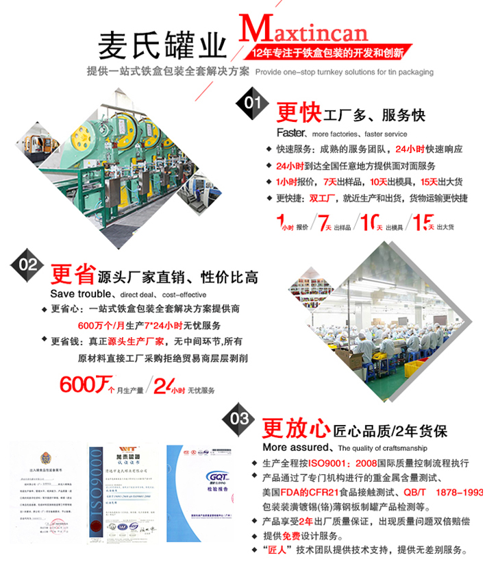 保健酒鐵盒加工廠——清遠(yuǎn)市麥?zhǔn)瞎迾I(yè)多年來(lái)以的產(chǎn)品、誠(chéng)信的服務(wù)深受廣大商家客戶的青睞。提供的產(chǎn)品質(zhì)量上乘、價(jià)格合理,鐵盒產(chǎn)品多年通過(guò)ISO、SGS等機(jī)構(gòu)測(cè)試,為您提供的鐵盒包裝產(chǎn)品。